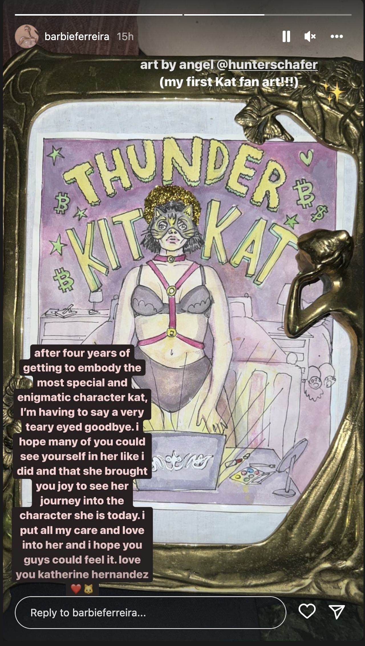 Ferreira shared an image of a sketch by Euphoria costar Hunter Schafer on her Instagram Stories writing, “After four years of getting to embody the most special and enigmatic character Kat, I’m having to say a very teary-eyed goodbye. I hope many of you could see yourself in her like I did and that she brought you joy to see her journey into the character she is today. I put all my care and love into her, and I hope you guys could feel it. Love you, Katherine Hernandez.”