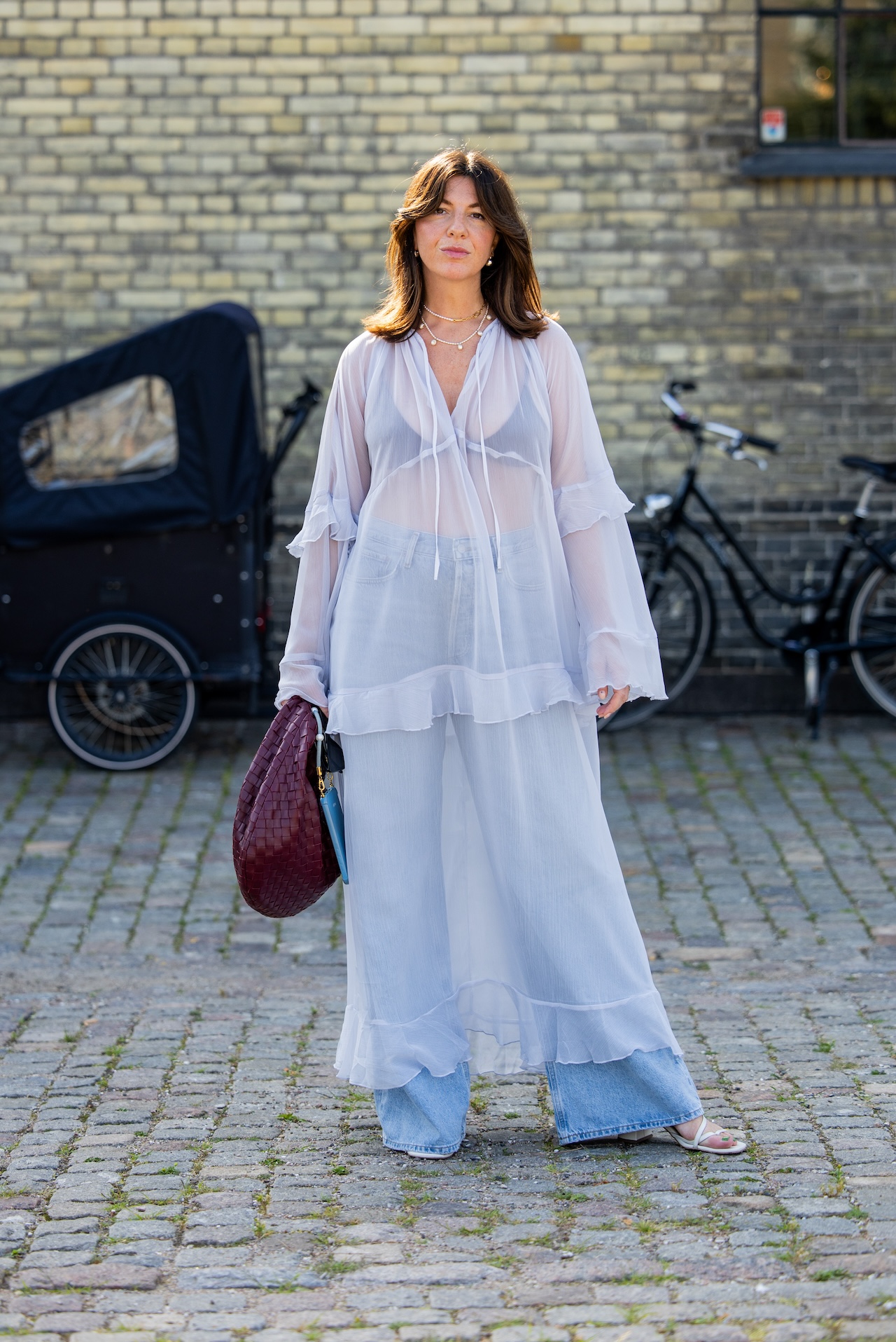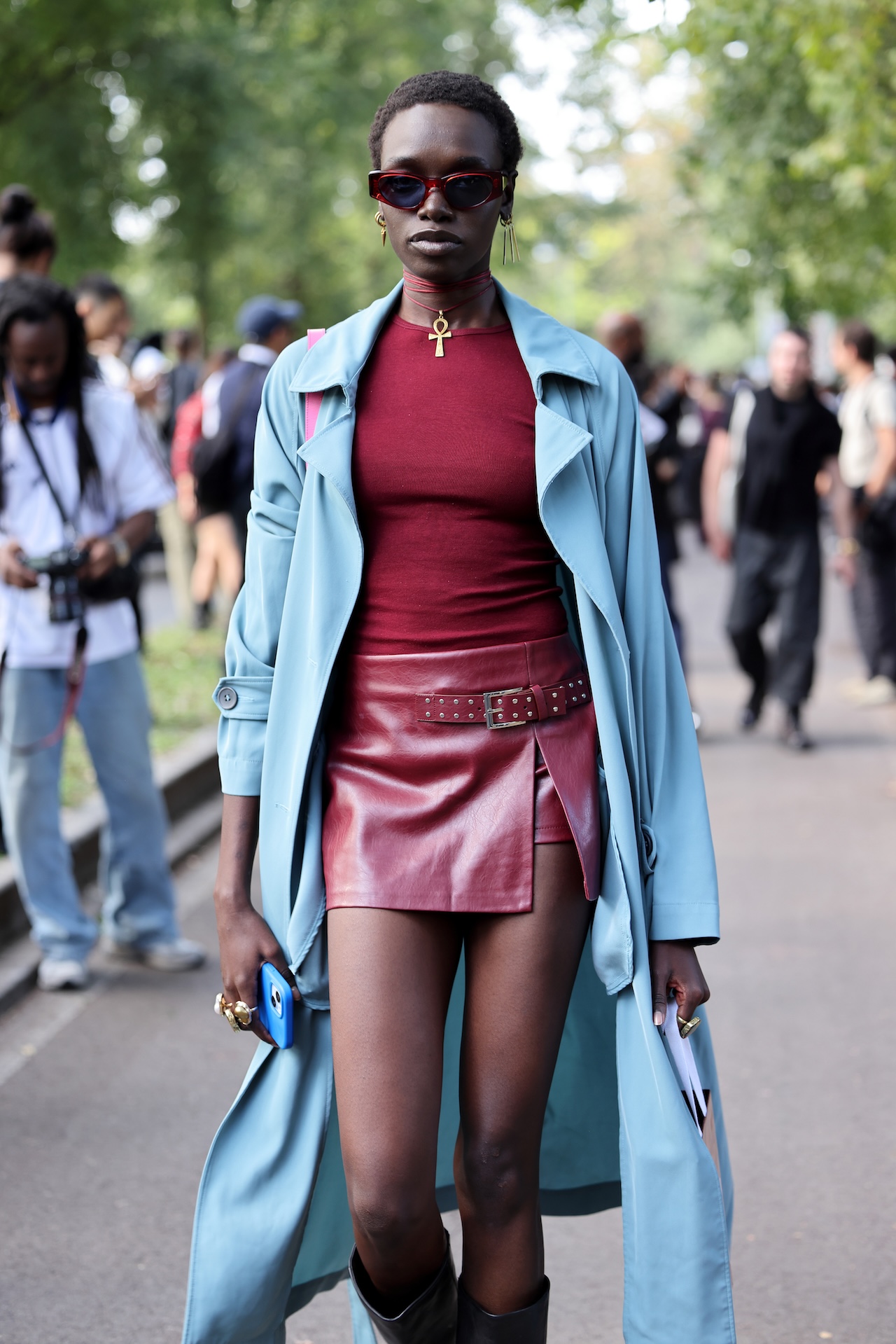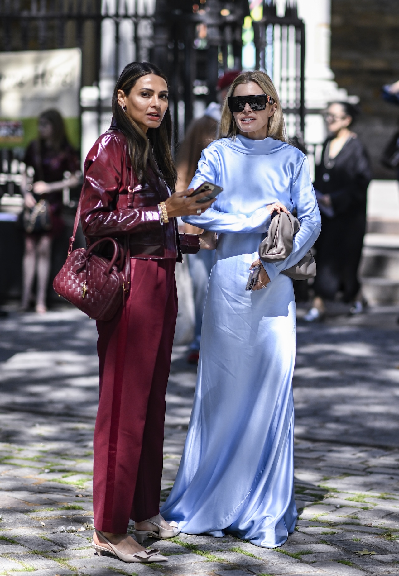 COPENHAGEN, DENMARK – AUGUST 6: Gili Biegun wears black sunglasses, gold earrings, silver necklace, light blue flowy cropped long sleeve shirt, silver rings, shiny dark red leather bag, dark red maxi skirt, light brown sandals, outside Lovechild 1979, during the Copenhagen Fashion Week Spring/Summer 2024-2025 on August 6, 2024 in Copenhagen, Denmark. (Photo by Edward Berthelot/Getty Images)PARIS, FRANCE – FEBRUARY 28: Flora Coquerel wears light blue shirt dress with matching tie, burgundy jacket, black lace tights, brown boots, burgundy bag, outside Casablanca, during the Womenswear Fall/Winter 2024/2025 as part of Paris Fashion Week on February 28, 2024 in Paris, France. (Photo by Claudio Lavenia/Getty Images)NEW YORK, NEW YORK – SEPTEMBER 06: Tamara Kalinic wears black rimmed sunglasses with orange lenses, black bandeau top, dark red oversized blazer jacket, light blue denim jean Area pants with cutout design silver detail design, black open toe toe mule heels, black leather handbag, gold bracelets, white gold rings, outside Area, during the New York Fashion week Spring/Summer 2025 on September 06, 2024 in New York, New York. (Photo by Edward Berthelot/Getty Images)MILAN, ITALY – SEPTEMBER 17: Gili Biegun wears light blue suit by Novitska, burgundy bag by TheMoire and burgundy shoes by Roger Vivier outside Iceberg show during the Milan Fashion Week Spring/Summer 2025 on September 17, 2024 in Milan, Italy. (Photo by Raimonda Kulikauskiene/Getty Images)NEW YORK, NEW YORK – SEPTEMBER 11: Divya Marther is seen wearing a red jacket, red pants and red bag with Elizabeth Sulcer is seen wearing a light blue dress, cream bag and black sunglasses outside the Ronald Van Der Kemp show during NYFW Spring/Summer 2025 on September 11, 2024 in New York City. (Photo by Daniel Zuchnik/Getty Images)COPENHAGEN, DENMARK – AUGUST 07: Francesca Saffari wears transparent dress, burgundy Bottega Veneta bag outside Herskind during day three of the Copenhagen Fashion Week (CPHFW) SS25 on August 07, 2024 in Copenhagen, Denmark. (Photo by Christian Vierig/Getty Images)MILAN, ITALY – SEPTEMBER 20: A guest wears burgundy top, burgundy leather mini skirt, light blue trench coat, black boots, outside Gucci, during the Milan Fashion Week Spring/Summer 2025 on September 20, 2024 in Milan, Italy. (Photo by Claudio Lavenia/Getty Images)