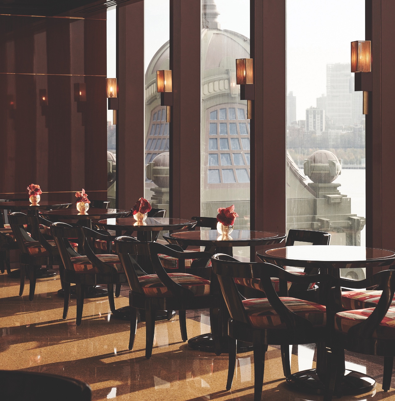 On a sunny day, the vistas from the upper levels’ outward-facing guestrooms are vintage New York: the Brooklyn Bridge, Governor’s Island, and the Statue of Liberty. But when clouds or fog shroud this part of Manhattan, guests can easily imagine themselves sailing off Giudecca in the Venetian Lagoon or passing through Hong Kong’s Victoria Harbor.