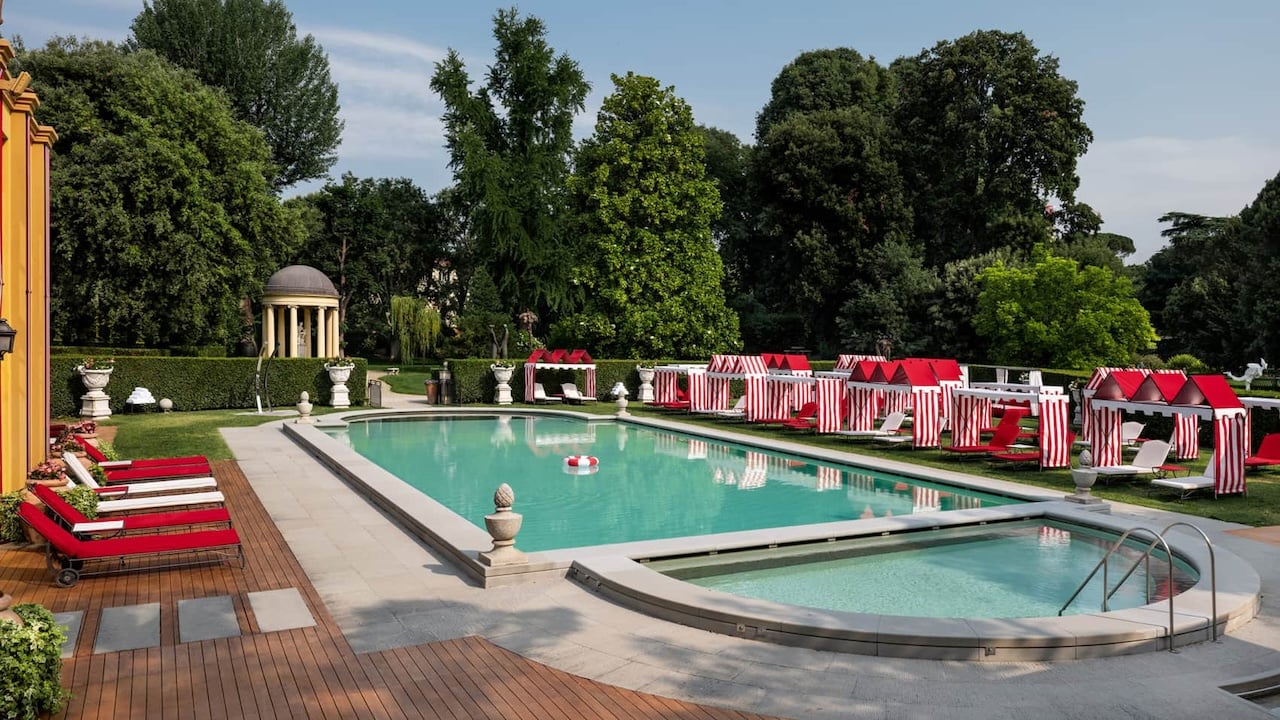 This is also where you’ll find Bagno Al Fresco — the Four Seasons’ answer to the Italian seaside fantasy. Red-and-white cabanas line the pool, striped umbrellas flutter, and suddenly you’re no longer in Florence but on holiday with Slim Aarons. It’s unabashedly glamorous — a tongue-in-cheek wink to Tuscan lido life, complete with poolside pizza and Aperol spritzes.