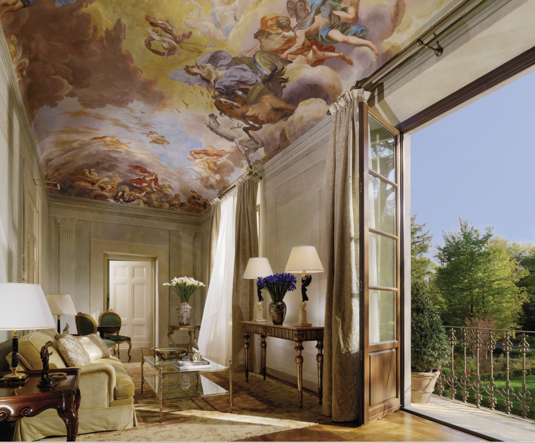 Every great hotel has a thesis, and this one’s is clearly beauty as continuity. My suite was all cream silk and ruby reds, hand-painted panels, and just enough gold leaf to stop short of kitsch. The ceiling was frescoed with a celestial scene — cherubs orbiting lazily above my laptop charger — and I felt, briefly, like a mildly underdressed Medici.
