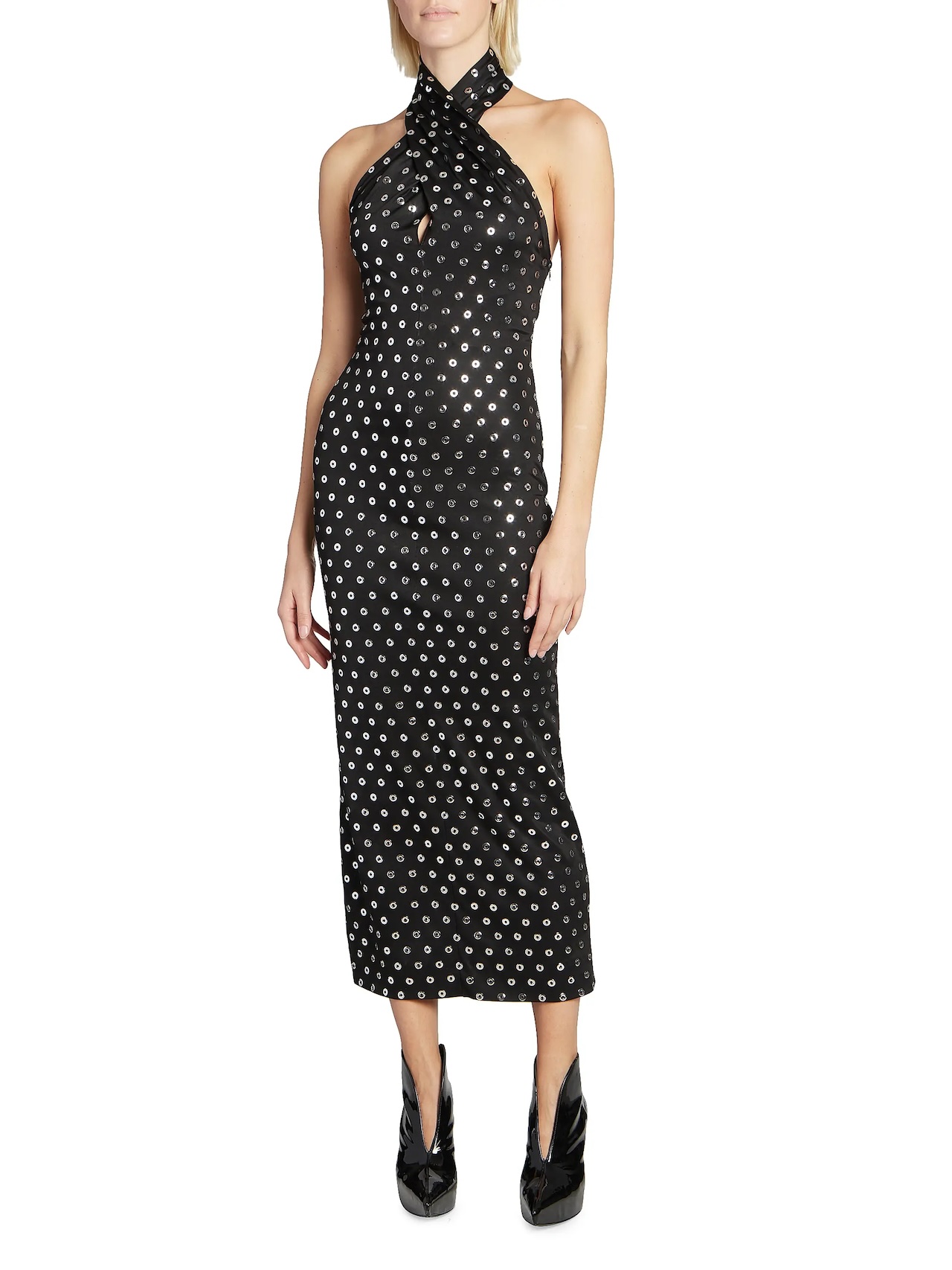 ALAÏA EYELET TURTLENECK SLEEVELESS DRESS, $1,110. SHOP NOW