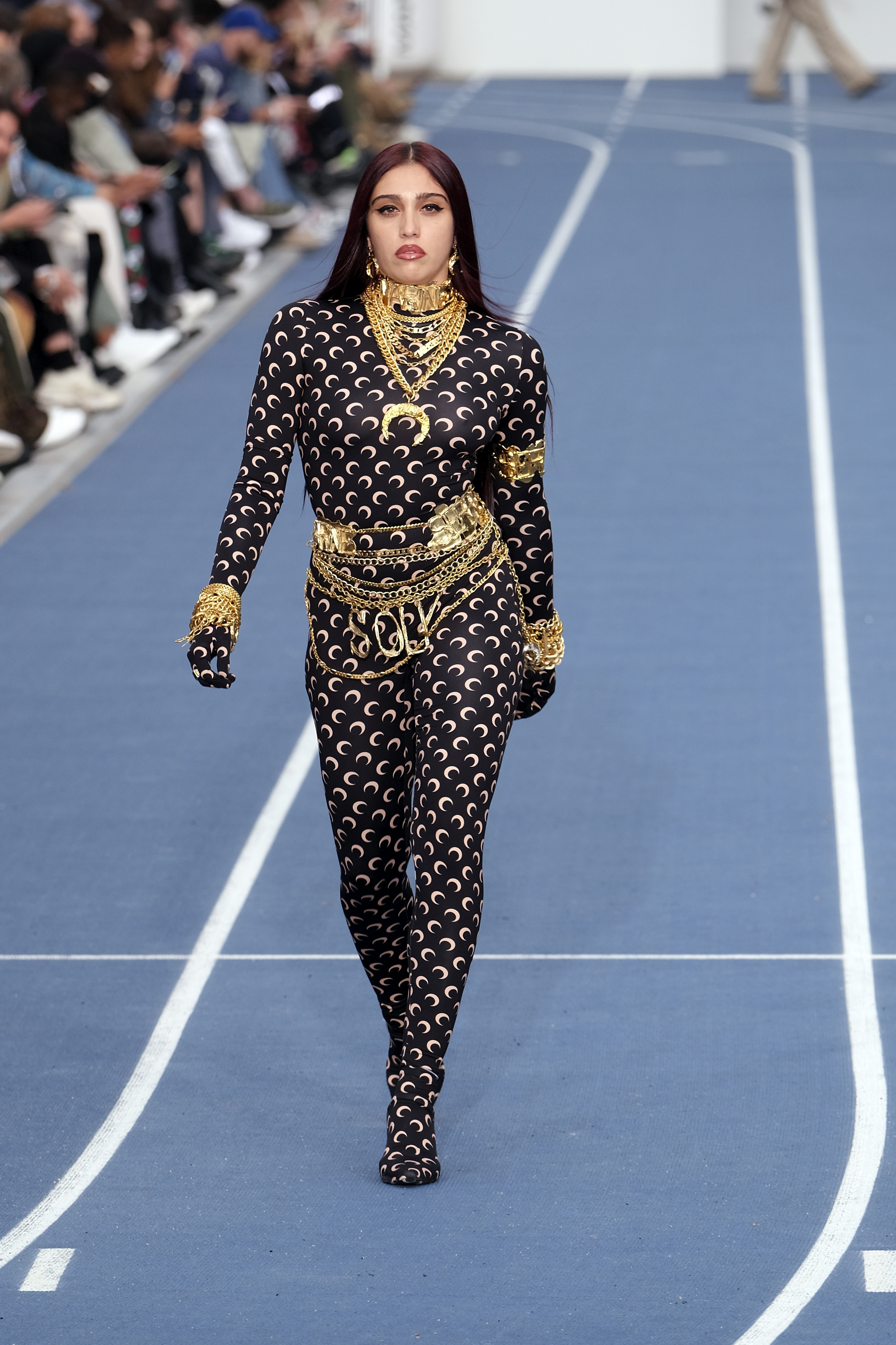 On June 25, the 25-year-old model (whose mother is the Queen of Pop and father is Carlos Leon) closed the show, which featured an A-list lineup including singer Jorja Smith, rugby player and reality TV star Kelegh Moutome, former soccer player Djibril Cissé, Paralympic gold medalist Alexis Hanquinquant, and fencer Margaux Rifkiss. Leon strutted down the basketball court that served as the show’s venue in a skin-tight catsuit featuring the brand’s signature crescent moon motif all over.