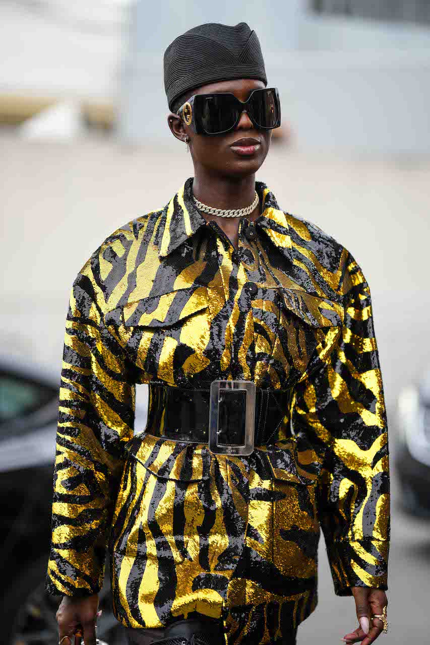 MILAN, ITALY – FEBRUARY 24: Jodie Turner-Smith wears a black hat, black large sunglasses from Gucci, a gold and diamonds large chain necklace , a black and gold embroidered sequined zebra pattern oversized shirt from Gucci, a black shiny varnished leather large belt, black shiny leather laces front heels tights-high boots / waders boots from Gucci, a black shiny leather silver nailed / studded handbag , outside Gucci, during the Milan Fashion Week Womenswear Fall/Winter 2023/2024 on February 24, 2023 in Milan, Italy. (Photo by Edward Berthelot/Getty Images)BOGOTA, COLOMBIA – MARCH 21: American singer Miley Cyrus performs on stage during a show at Movistar Arena on March 21, 2022 in Bogota, Colombia. (Photo by Guillermo Legaria/Getty Images for MC)