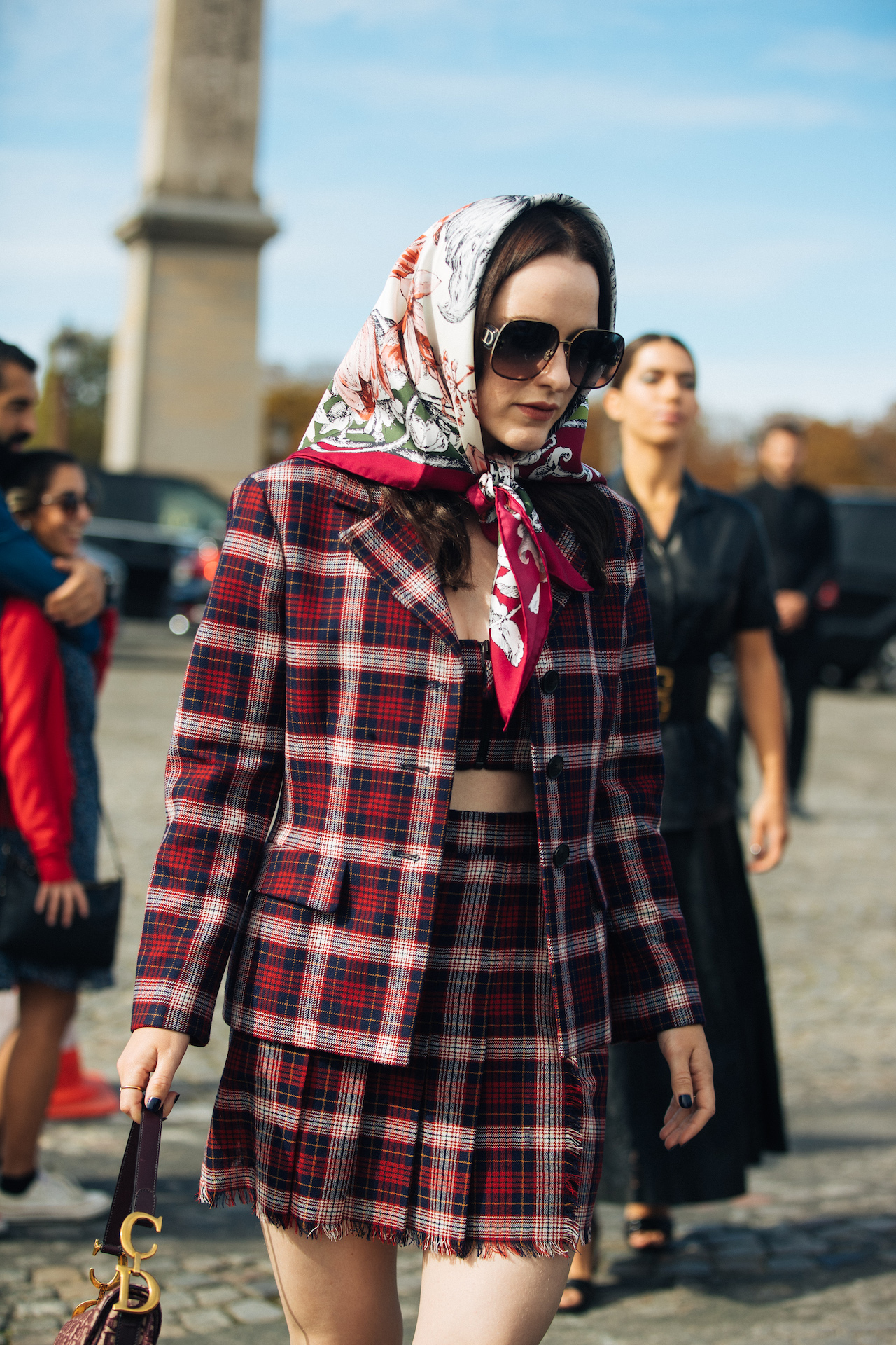 PARIS, FRANCE – SEPTEMBER 28: Actress Rachel Brosnahan wears a print headscarf, oversized sunglasses, a red plaid jacket and skirt, red flats, and carries a Dior bag at the Dior show on September 28, 2021 in Paris, France. (Photo by Melodie Jeng/Getty Images)
